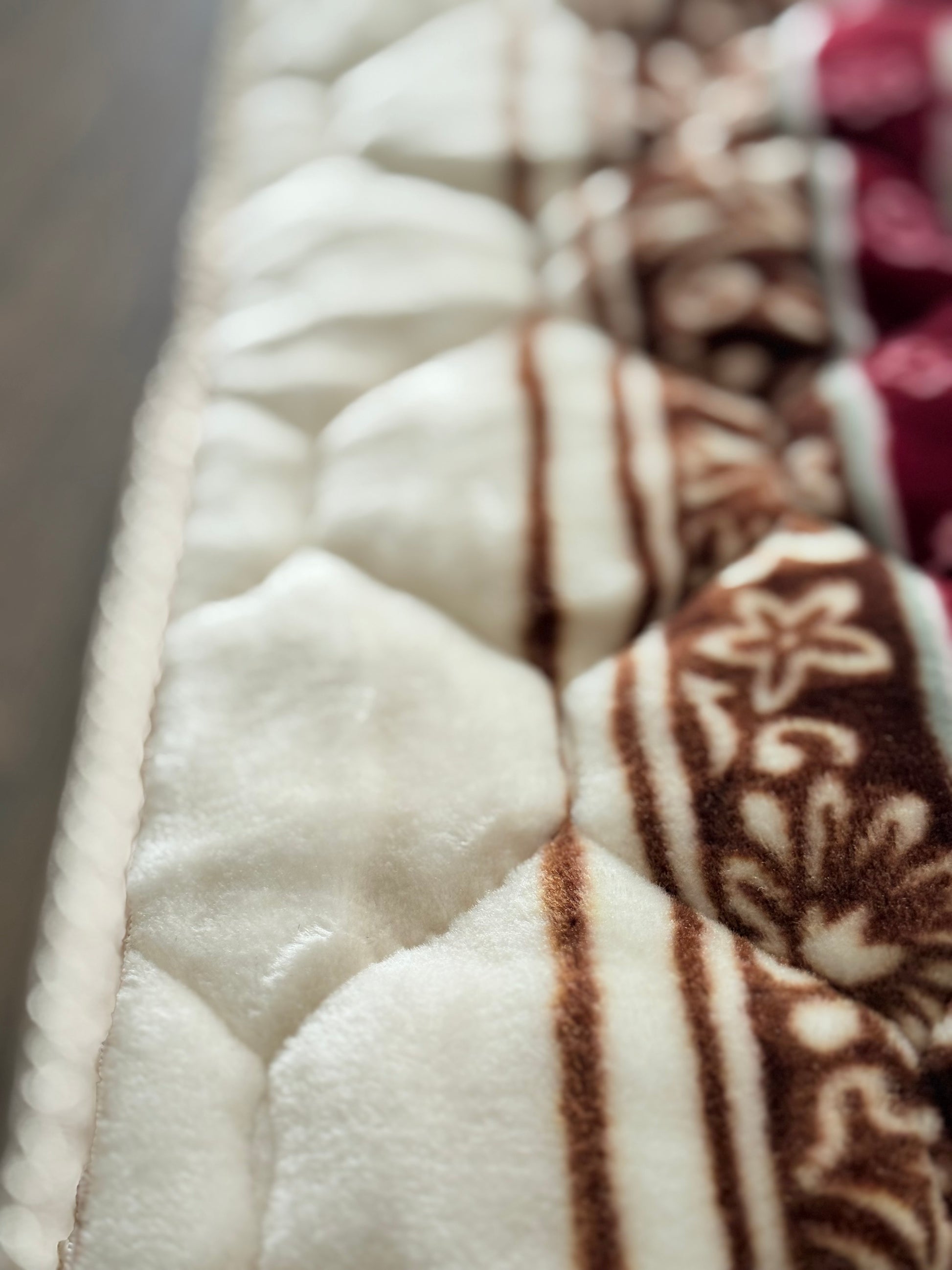 Featuring a soft cream base with a rich burgundy and chocolate brown archway design.