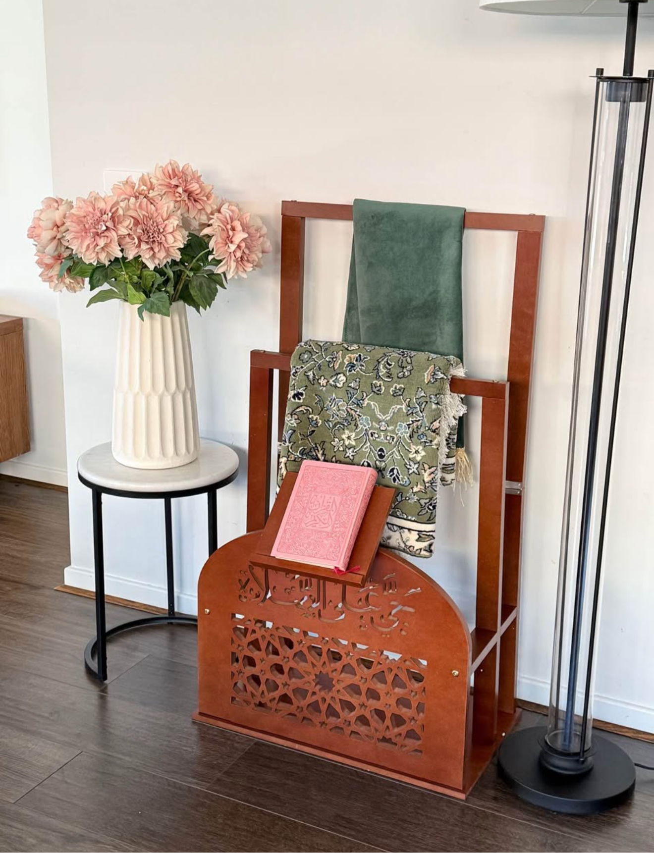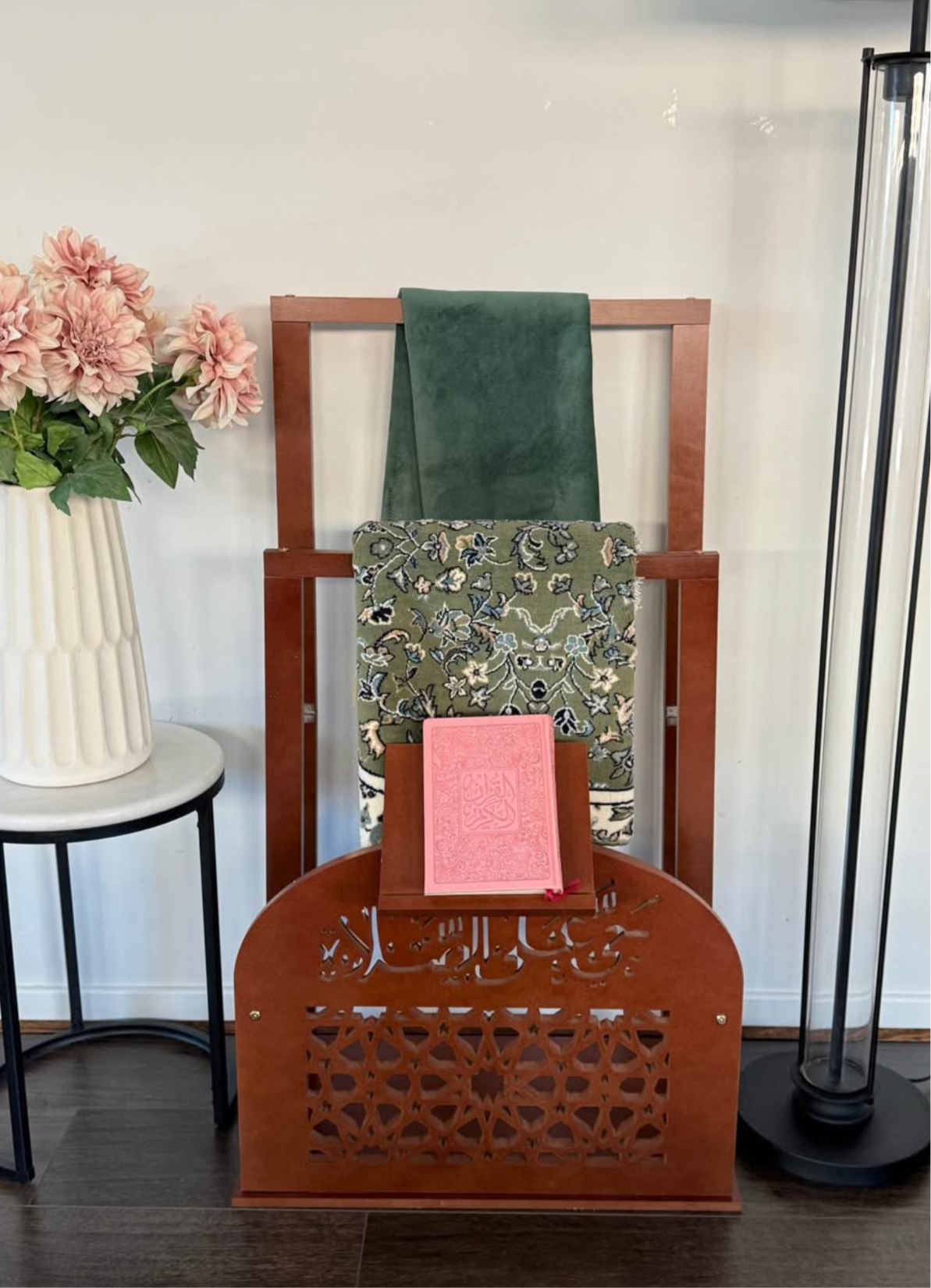 Designed to bring comfort and calm to your prayer space, this stand keeps your Qur’an, prayer mat, and essentials neatly in one place.